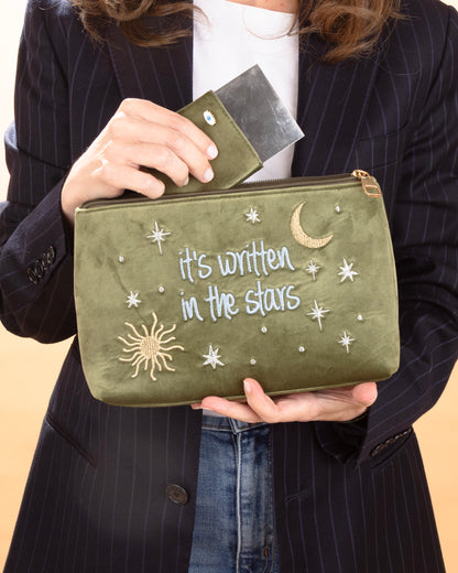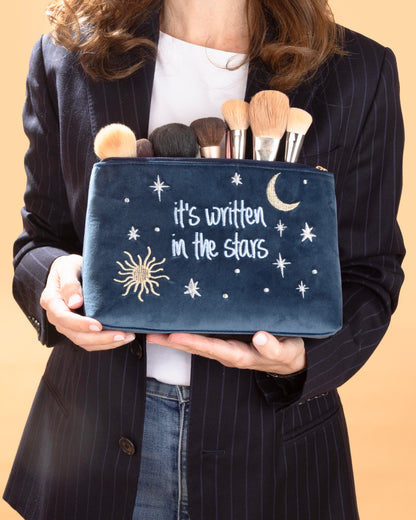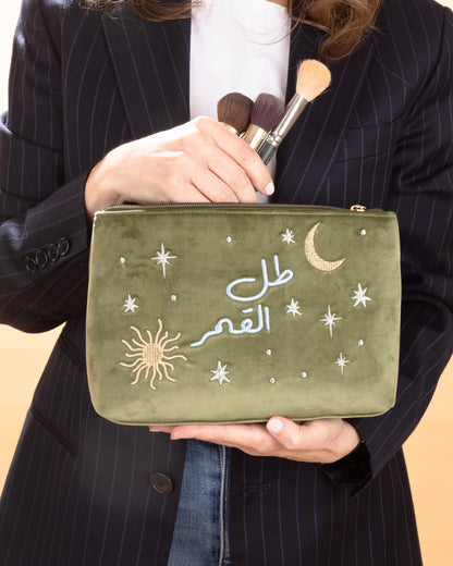 The statement pouch is made with beautiful velvet fabric and adorned with delicate embroidery, it is perfect for all your beauty products and accessories.